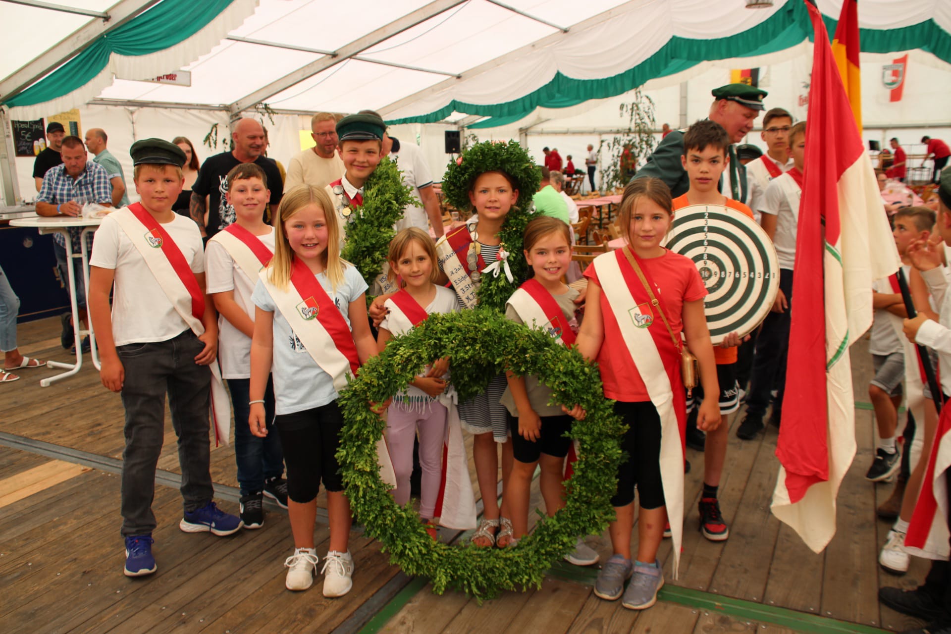 ![]() Viele Kinder bekamen Schärpen, um die Majestäten wie bei den Erwachsenen mit Fahne, Kranz, Scheibe und Begleitung nach Hause zu bringen. |